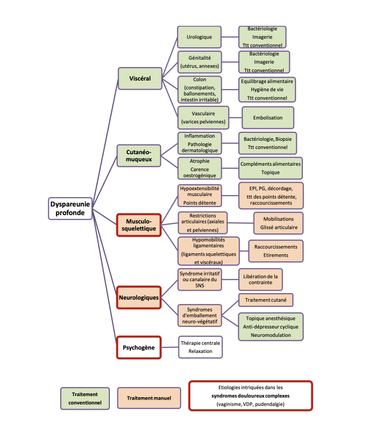 En effet, le traitement manuel étant composé d’une approche neuro-musculo-squelettique, celui-ci trouvera son intérêt dans les dyspareunies profondes ayant des origines musculaires, mais aussi ligamentaires, qu’il s’agisse des ligaments articulaires ou des ligaments suspenseurs de l’utérus, ou encore dans les dyspareunies profondes d’origine neurologique, qu’il s’agisse du système nerveux autonome ou neurovégétatif.