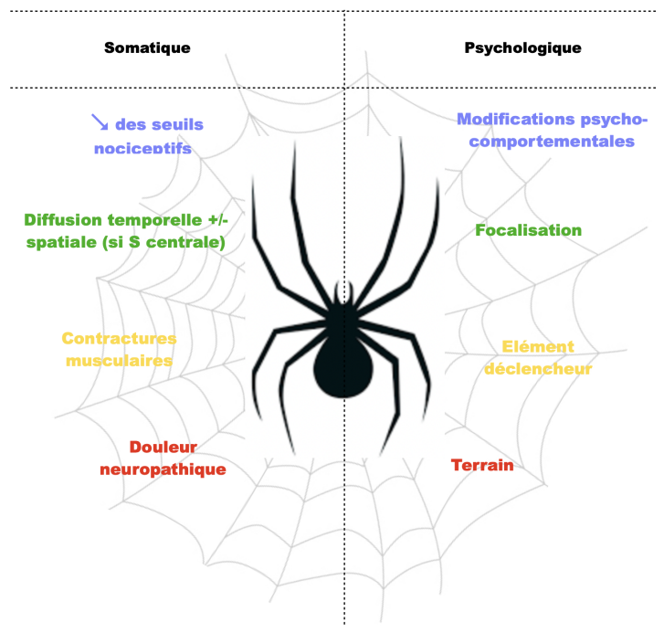 Les douleurs par sensibilisation comportent elles aussi, comme toutes les douleurs chroniques, des réactions d’hypertonies musculaires voire de syndromes myo-fasciaux.
