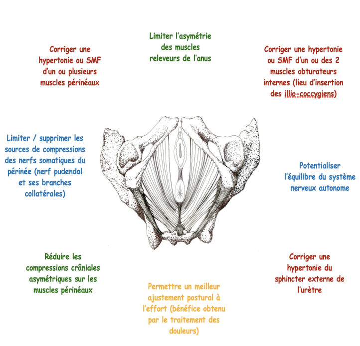 Une prise en charge en thérapie manuelle agit sur de nombreux facteurs influençants l’équilibre des muscles périnéaux.